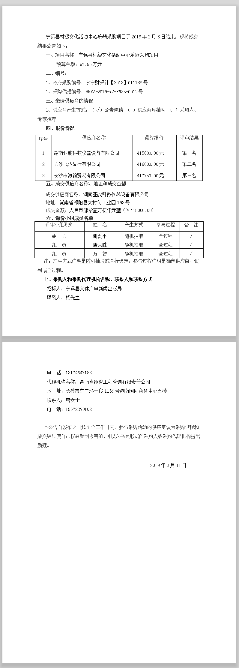 寧遠縣村級文化活動中心樂器采購項目 詢價采購成交結果公告