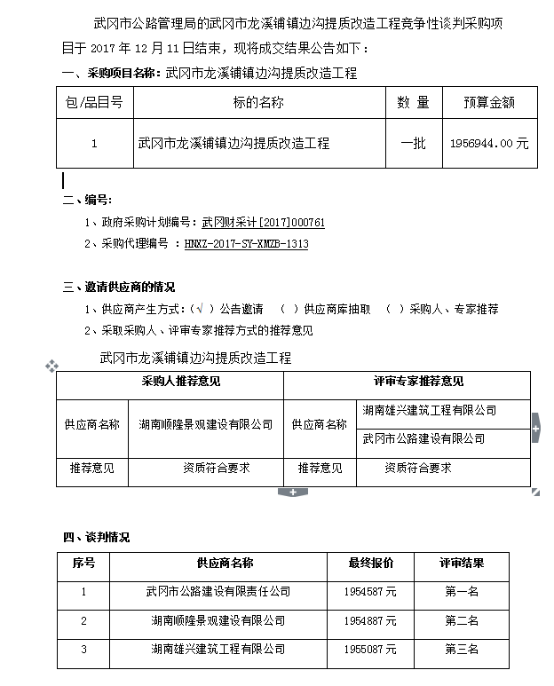 武岡市龍溪鋪鎮(zhèn)邊溝提質(zhì)改造工程 競爭性談判成交結(jié)果公告