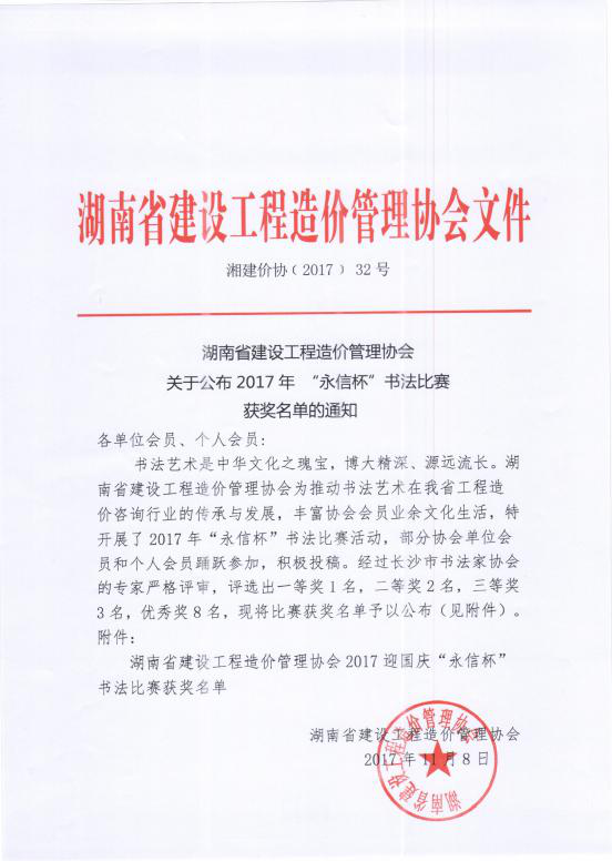 【喜訊】熱烈祝賀我司王佳勇在湖南省建設(shè)工程造價(jià)管理協(xié)會(huì)2017年 “永信杯”書法比賽獲得二等獎(jiǎng)