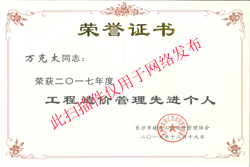 造價一部經(jīng)理、注冊造價工程師萬克太同志榮獲長沙市建設(shè)工程造價管理協(xié)會頒發(fā)的2017年度工程造價管理先進(jìn)個人稱號。