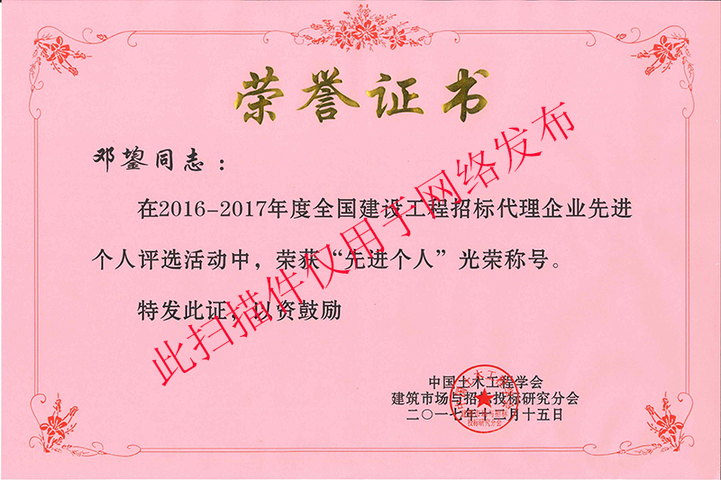 公司鄧鋆總經(jīng)理獲得中國(guó)土木工程學(xué)會(huì)建筑市場(chǎng)與招標(biāo)投標(biāo)研究分會(huì)頒發(fā)的2017年度全國(guó)建設(shè)工程招標(biāo)代理企業(yè)先進(jìn)個(gè)人稱號(hào)