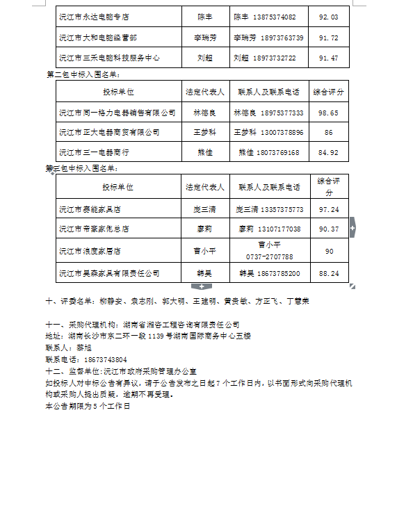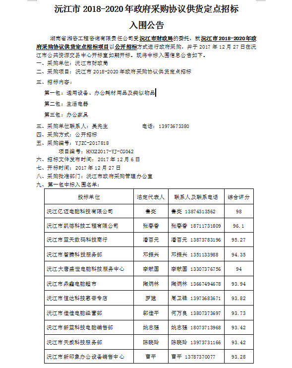 沅江市2018-2020年政府采購協(xié)議供貨定點招標 入圍公告