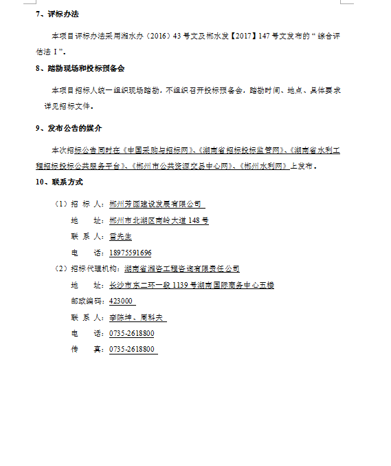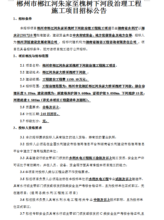 郴州市郴江河朱家至槐樹下河段治理工程施工項目招標公告