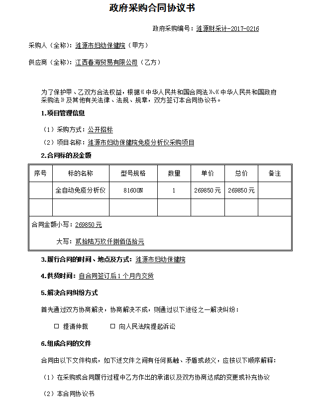 漣源市婦幼保健院免疫分析儀采購(gòu)項(xiàng)目政府采購(gòu)合同公示