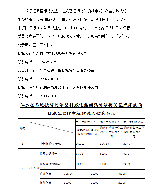 江永縣易地扶貧同步整村搬遷瀟浦鎮(zhèn)陳家街安置點(diǎn)建設(shè)項(xiàng)目施工監(jiān)理中標(biāo)候選人公示