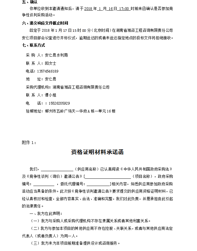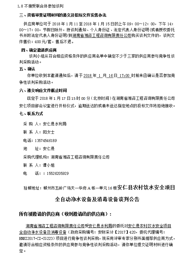 安仁縣農(nóng)村飲水安全項目全自動凈水設(shè)備及消毒設(shè)備談判公告