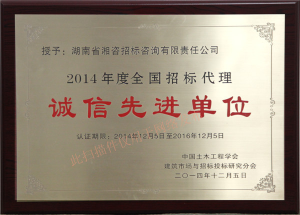 熱烈慶祝我司榮獲2014年度全國招標(biāo)代理誠信先進(jìn)單位