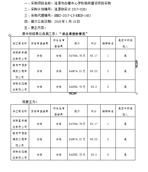 漣源市古塘中心學校廁所建設項目采購中標結果更正公告