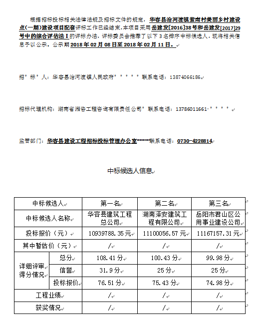 華容縣治河渡鎮(zhèn)紫南村美麗鄉(xiāng)村建設點(一期)建設項目配套中標候選人公示