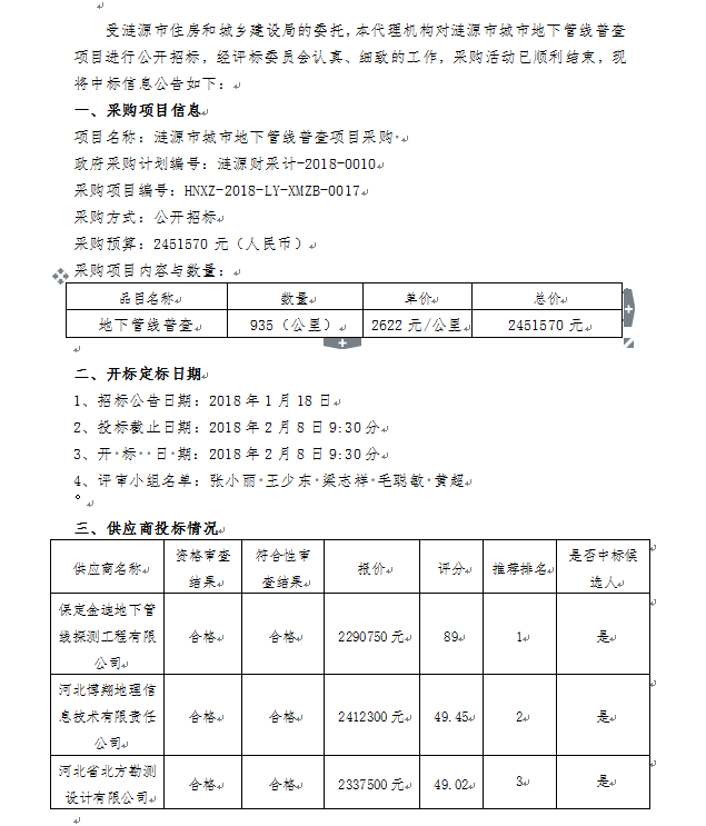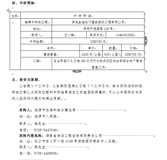 漣源市城市地下管線普查項目采購中標(biāo)結(jié)果公告