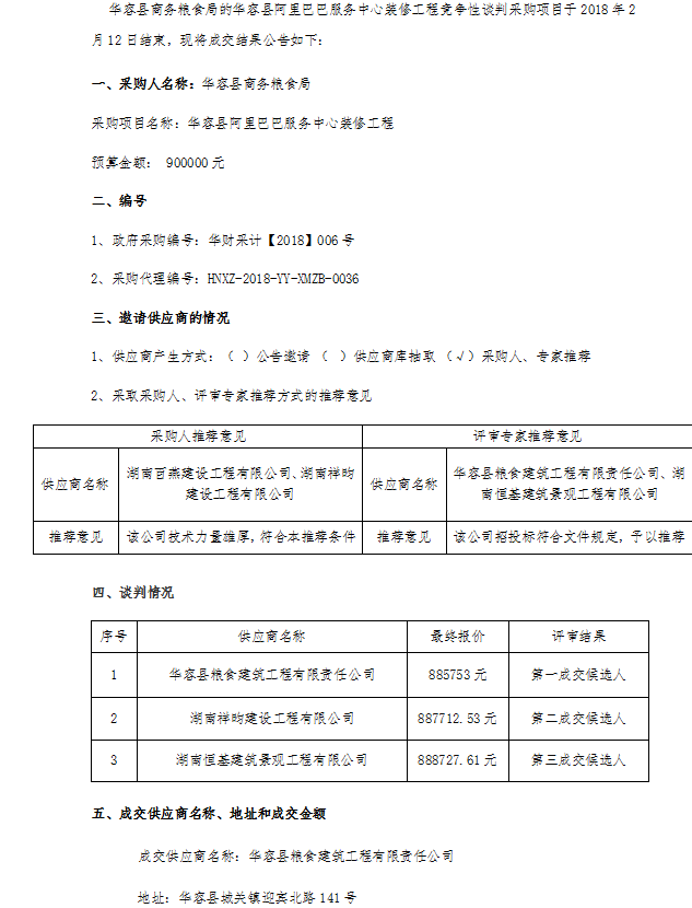 華容縣阿里巴巴服務(wù)中心裝修工程政府采購項(xiàng)目競爭性談判 成交結(jié)果公告