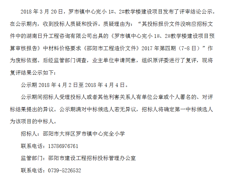 羅市鎮(zhèn)中心完小1#、2#教學(xué)樓建設(shè)項(xiàng)目 招標(biāo)投標(biāo)信息公示表(復(fù)評(píng))
