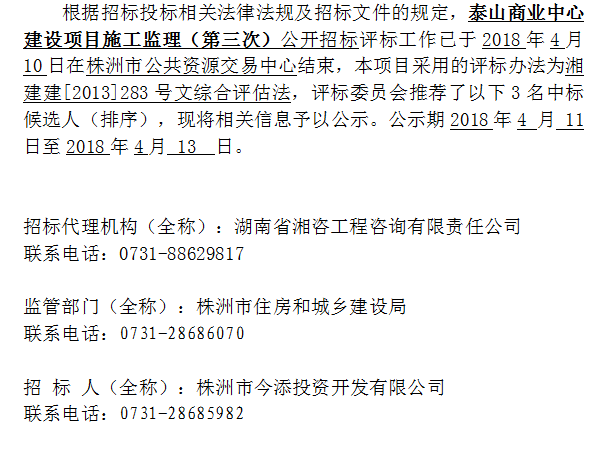 泰山商業(yè)中心建設項目施工監(jiān)理(第三次)招標投標信息公示表