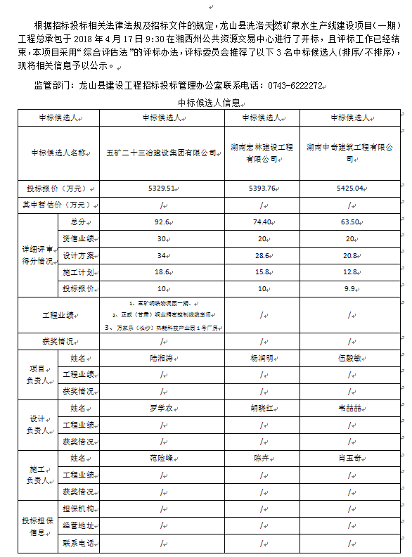 龍山縣洗洛天然礦泉水生產(chǎn)線建設(shè)項目(一期)工程總承包中標(biāo)候選人公示