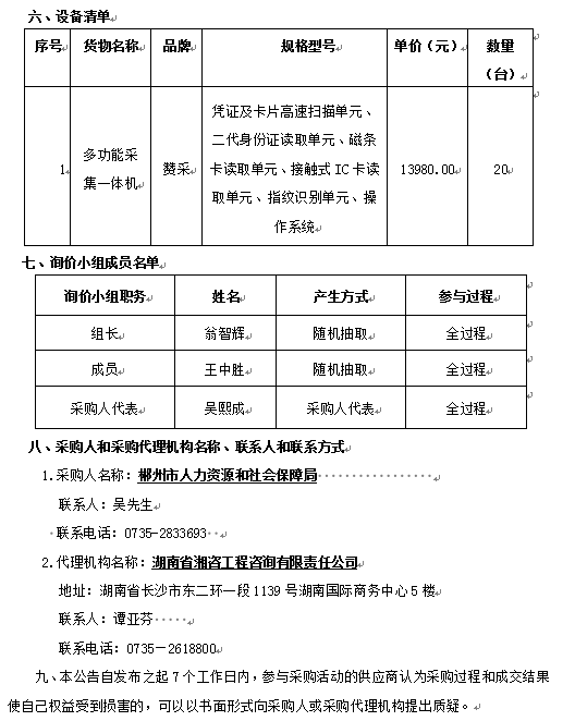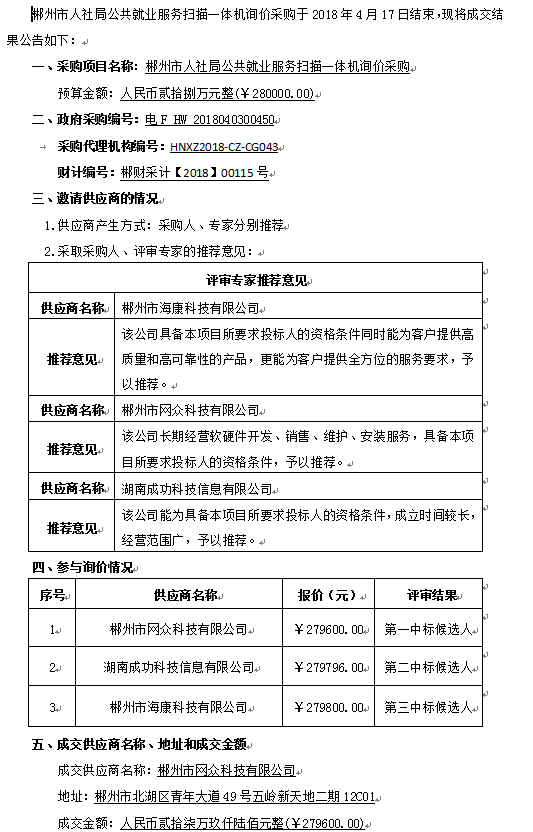 郴州市人社局公共就業(yè)服務(wù)掃描一體機(jī)詢價(jià)采購(gòu)成交結(jié)果公告