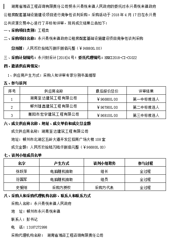 永興縣悅來鎮(zhèn)政府公租房配套基礎(chǔ)設(shè)施建設(shè)項目競爭性談判采購成交公告