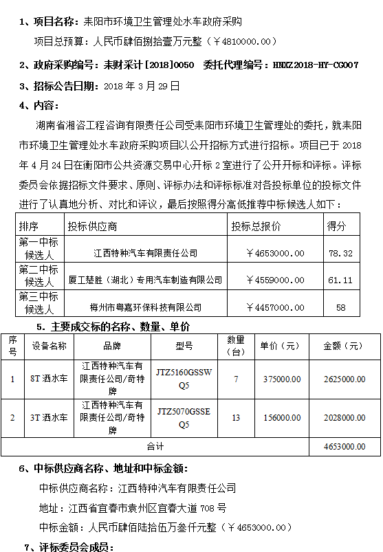 耒陽(yáng)市環(huán)境衛(wèi)生管理處水車(chē)政府采購(gòu)評(píng)標(biāo)結(jié)果公示