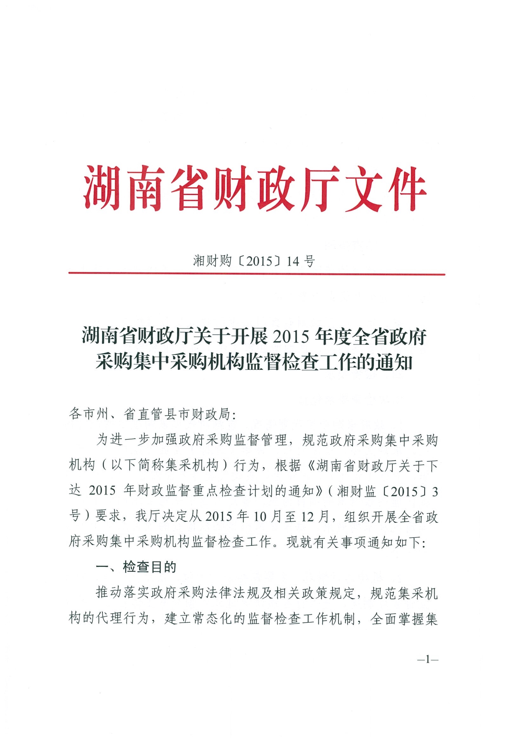 湖南省財(cái)政廳關(guān)于開展2015年度全省政府采購集中采購機(jī)構(gòu)監(jiān)督檢查工作的通知(湘財(cái)購【2015】14號(hào))